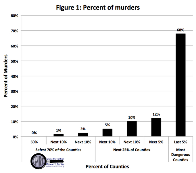 The worst 1 percent of counties have 19 percent of the population and 37 percent of the murders in 2014. The worst 2 percent of counties contain 47 percent of the population and accounted for 51 percent of the murders. 68 percent of the murders occurred in only 5 percent of counties.